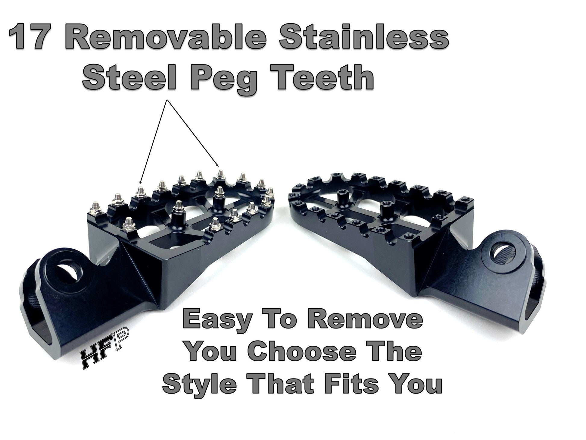 · Foot pegs come with 39 REMOVEABLE stainless steel cleats. You can leave them in if you’re wanting more traction and that off road look or you can remove them for a smoother look and feel on your feet.