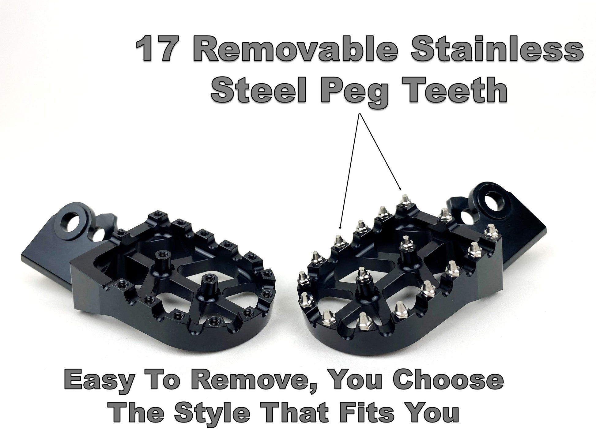 · Foot pegs come with 39 REMOVEABLE stainless steel cleats. You can leave them in if you’re wanting more traction and that off road look or you can remove them for a smoother look and feel on your feet.